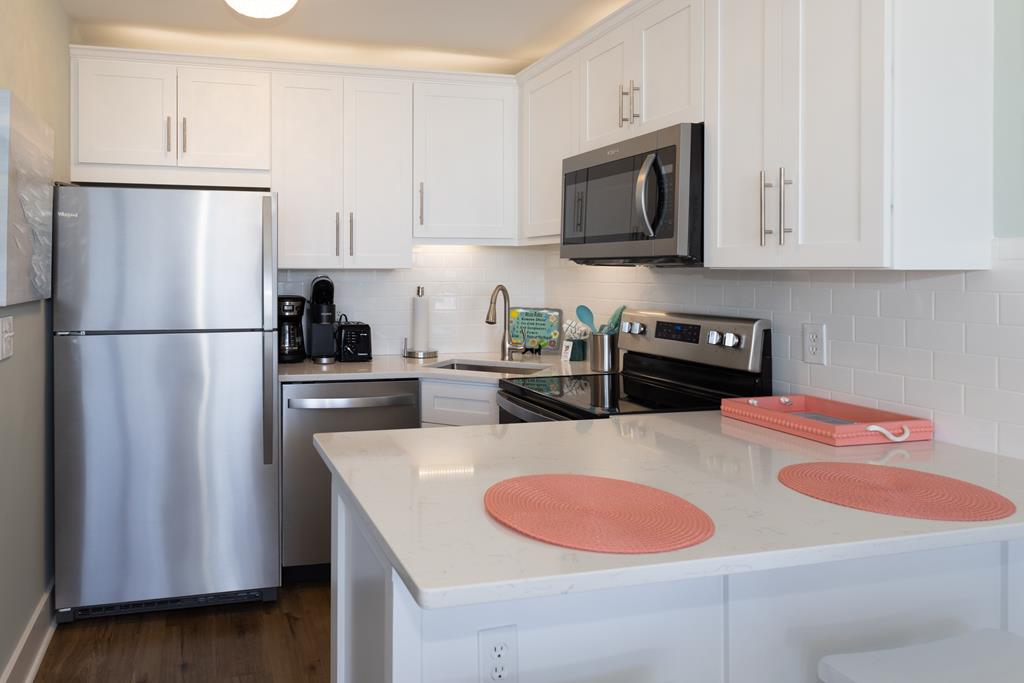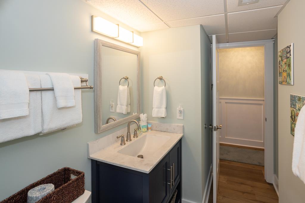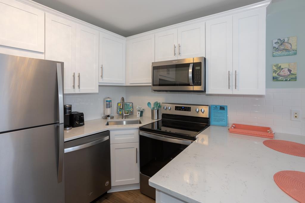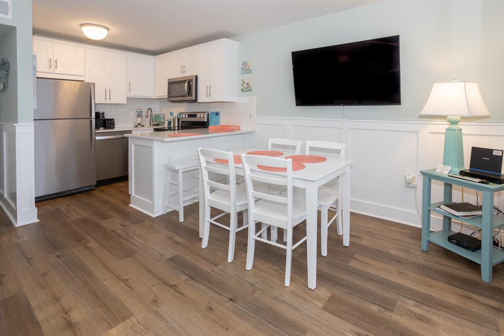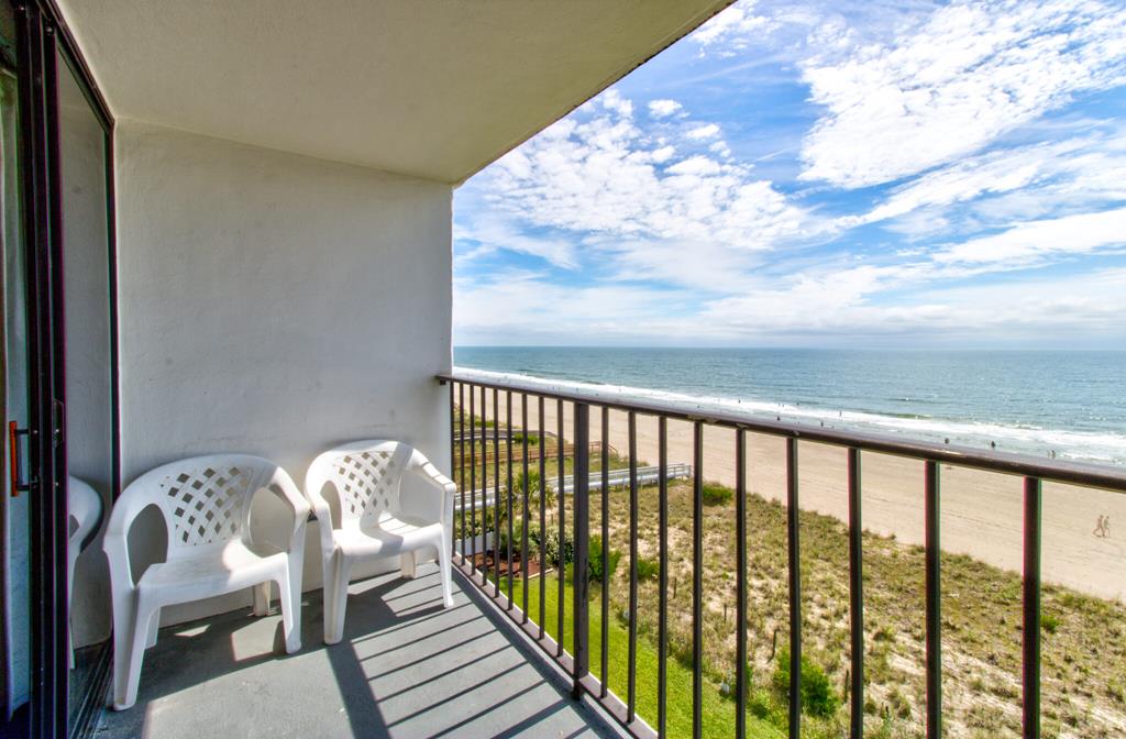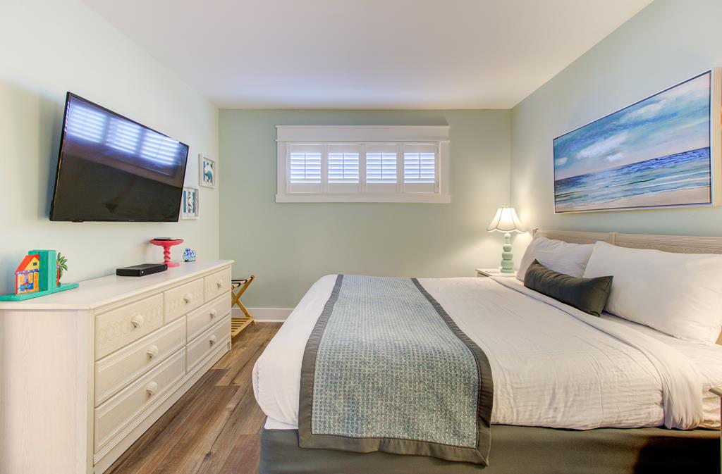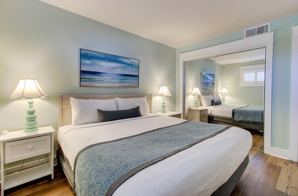 One bedroom one bath oceanfront suite with private oceanfront balcony. COMPLETELY RENOVATED FOR 2023! Extensive all new interior trim, doors, smooth ceilings, new flooring, cabinets, countertops, dishes, appliances (large & small) and wall décor have been added for your enjoyment! The enlarged living room features a recliner and queen sleeper sofa with new cool gel memory foam mattress. Two new 4KHD Smart TV’s (55” and 50”). King size master bed, Non-smoking unit, sleeps 4.